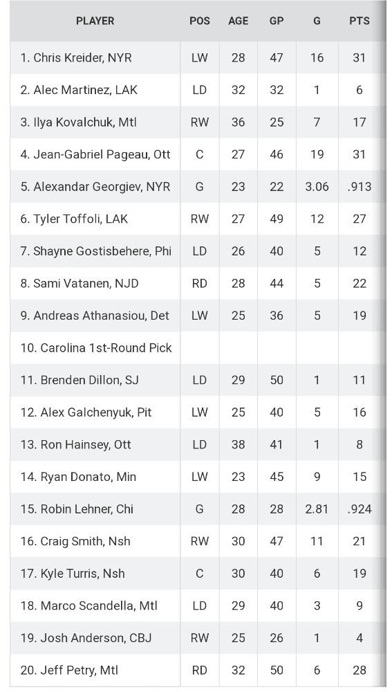 Známa kanadská televízia TSN sa preto rozhodla zverejniť mená dvadsiatich najlepších hokejistov, ktorí by sa pred rozhodujúcou časťou sezóny mohli sťahovať. Aj napriek tomu, že NHL momentálne čaká dlhšia prestávka spôsobená Zápasom hviezd, generálni manažéri jednotlivých tímov už počas nej spriadajú plány na posilnenie svojich súpisiek.